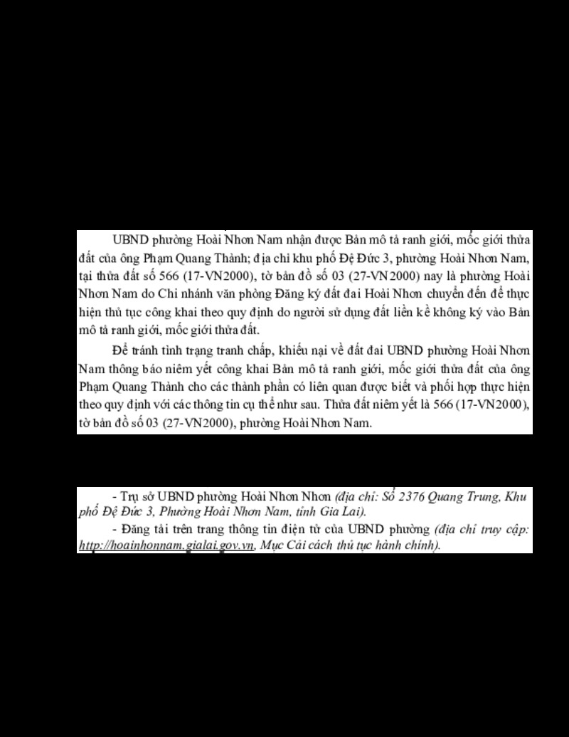 Thông báo về việc niêm yết Bản mô tả ranh giới, mốc giới thửa đất của ông Phạm Quang Thành 27/10/2025, 07:31:16 - Lượt xem: 1 Tweet Thêm vào danh sách Báo xấu Thông tin tài liệu Thông báo về việc niêm yết Bản mô tả ranh giới, mốc giới thửa đất của ông Phạm Quang Thành