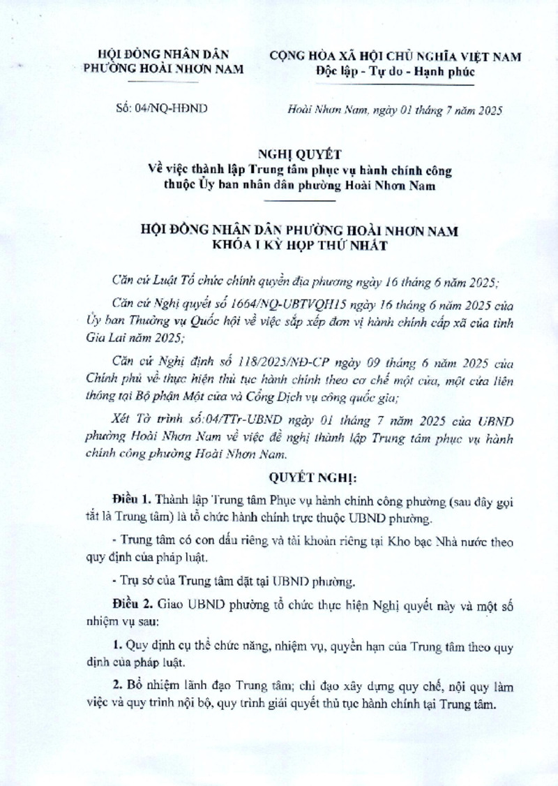 Nghị Quyết về việc thành lập Trung tâm phục vụ hành chính công thuộc UBND phường Hoài Nhơn Nam 01/07/2025, 14:04:59 - Lượt xem: 3 Tweet Thêm vào danh sách Báo xấu Thông tin tài liệu Nghị Quyết về việc thành lập Trung tâm phục vụ hành chính công thuộc UBND phường Hoài Nhơn Nam