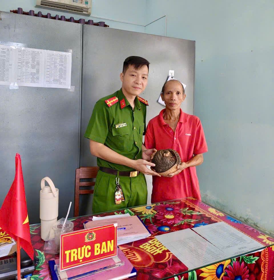 Trước đó, vào khoảng 20h00 ngày 09/10/2025, trong lúc dọn dẹp nhà, ông Vinh phát hiện 01 cá thể tê tê bò vào sân. Nhận thức được đây là loài động vật rừng nguy cấp, quý, hiếm nên ông đã giữ lại và mang đến Công an phường giao nộp.