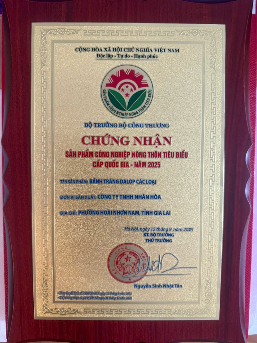 Ngày 15/9/2025, Bộ Công Thương đã trao Chứng nhận sản phẩm công nghiệp nông thôn tiêu biểu cấp quốc gia năm 2025 cho sản phẩm Bánh tráng Dalop các loại của Công ty TNHH Nhân Hòa, phường Hoài Nhơn Nam, tỉnh Gia Lai.