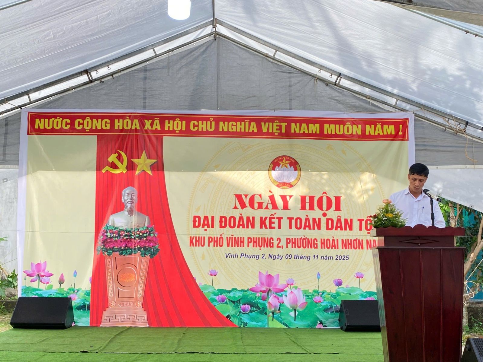 Phát biểu tại Ngày hội, lãnh đạo phường Hoài Nhơn Nam biểu dương những thành quả đạt được của khu phố Vĩnh Phụng 2 trong năm 2025. Đồng thời mong muốn, trong thời gian tới, cán bộ, đảng viên và nhân dân khu phố tiếp tục phát huy tinh thần đoàn kết để cùng chung tay xây dựng địa phương, phường ngày càng phát triển thanh bình và hạnh phúc.